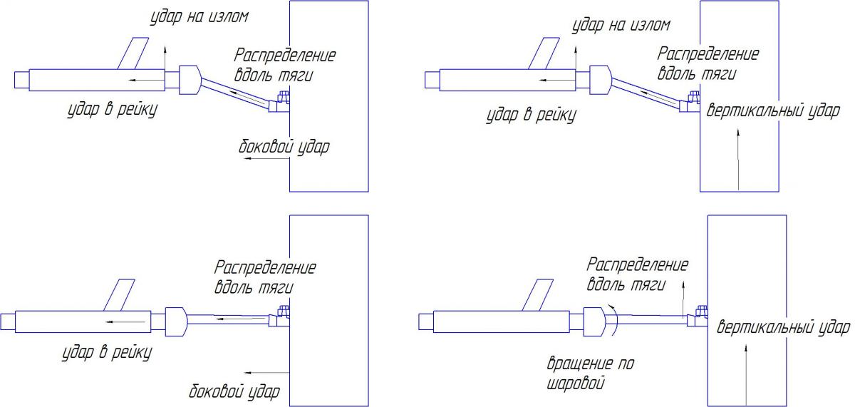 если тяги под углом, что вертикальный, что горизонтальный удар передается вдоль тяги, а та в свою очередь в шток рейки, и тем самым рейка получает удары на излом