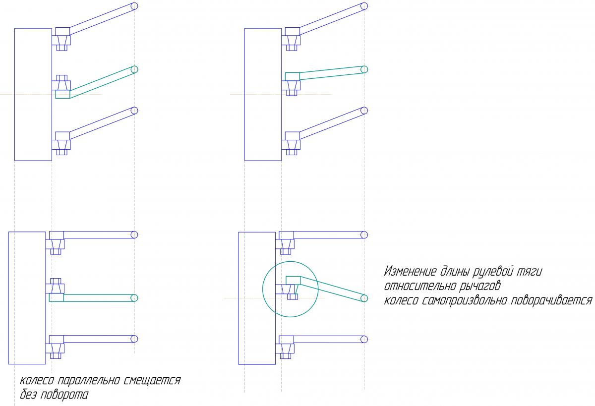 Изначально рулевой наконечник приходит к центру колеса, поле переделки он стал приходит сверху, со смещением где-то 150мм. в итоге при наклоне машины, колеса стали передавать наклон на руль и самопроизвольно поварачиваться